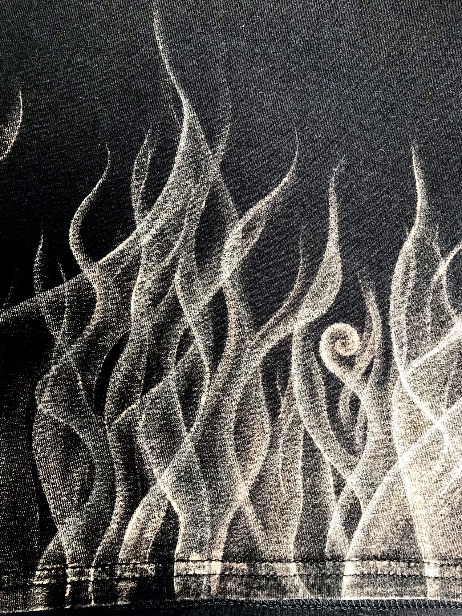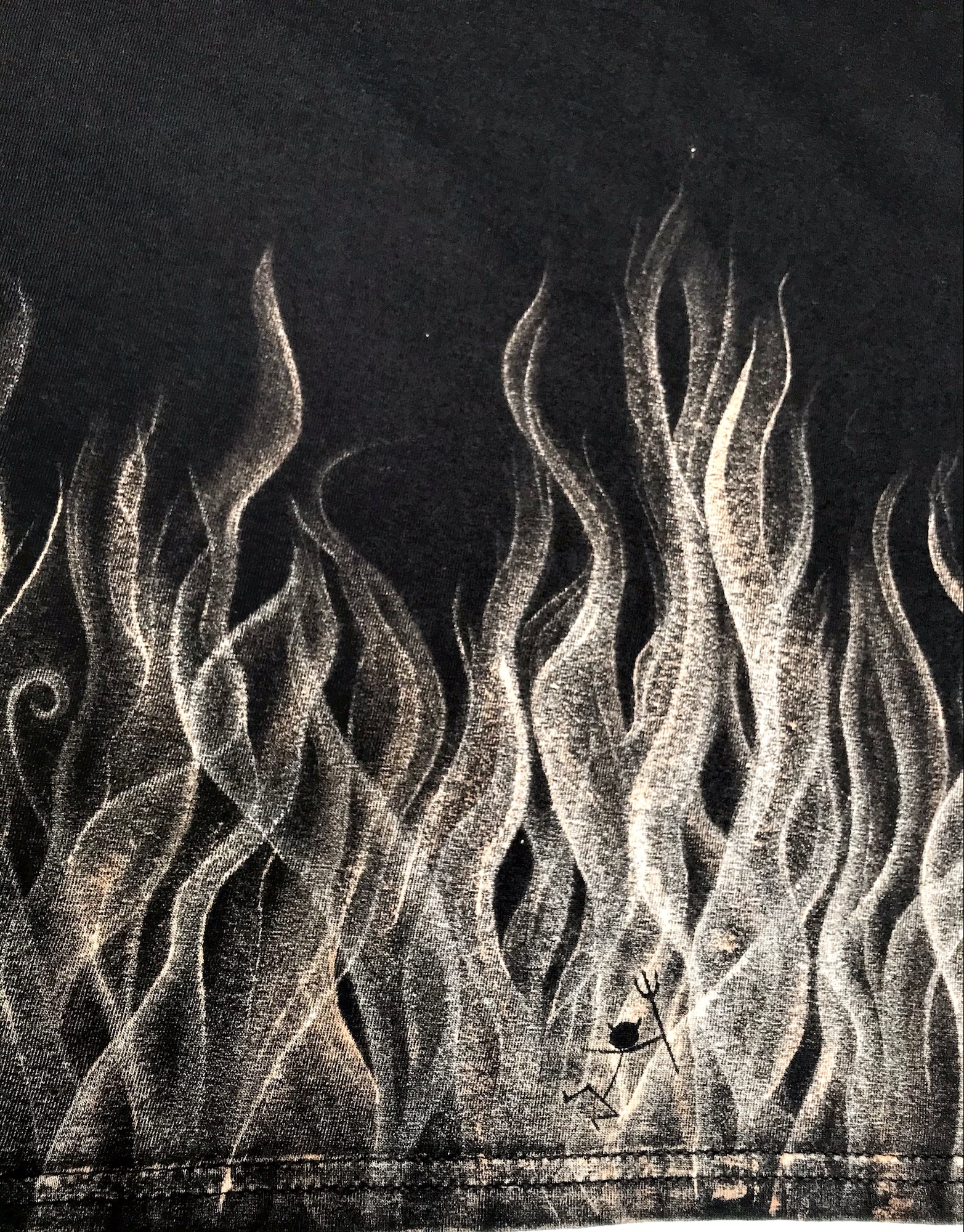 Originally a one-off commission but I found out I really love painting fire as it’s so varied. Flames go all around the bottom hem, front and back. Available with or without a little demon (just scroll to the next form). Also available with long sleeves here.