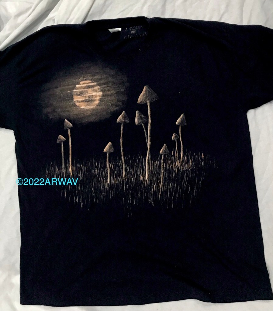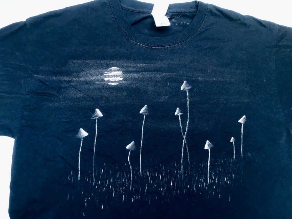 Psilocybe semilanceata fungus shining and waving hypnotically in the moonlight. Also available with long sleeves here.