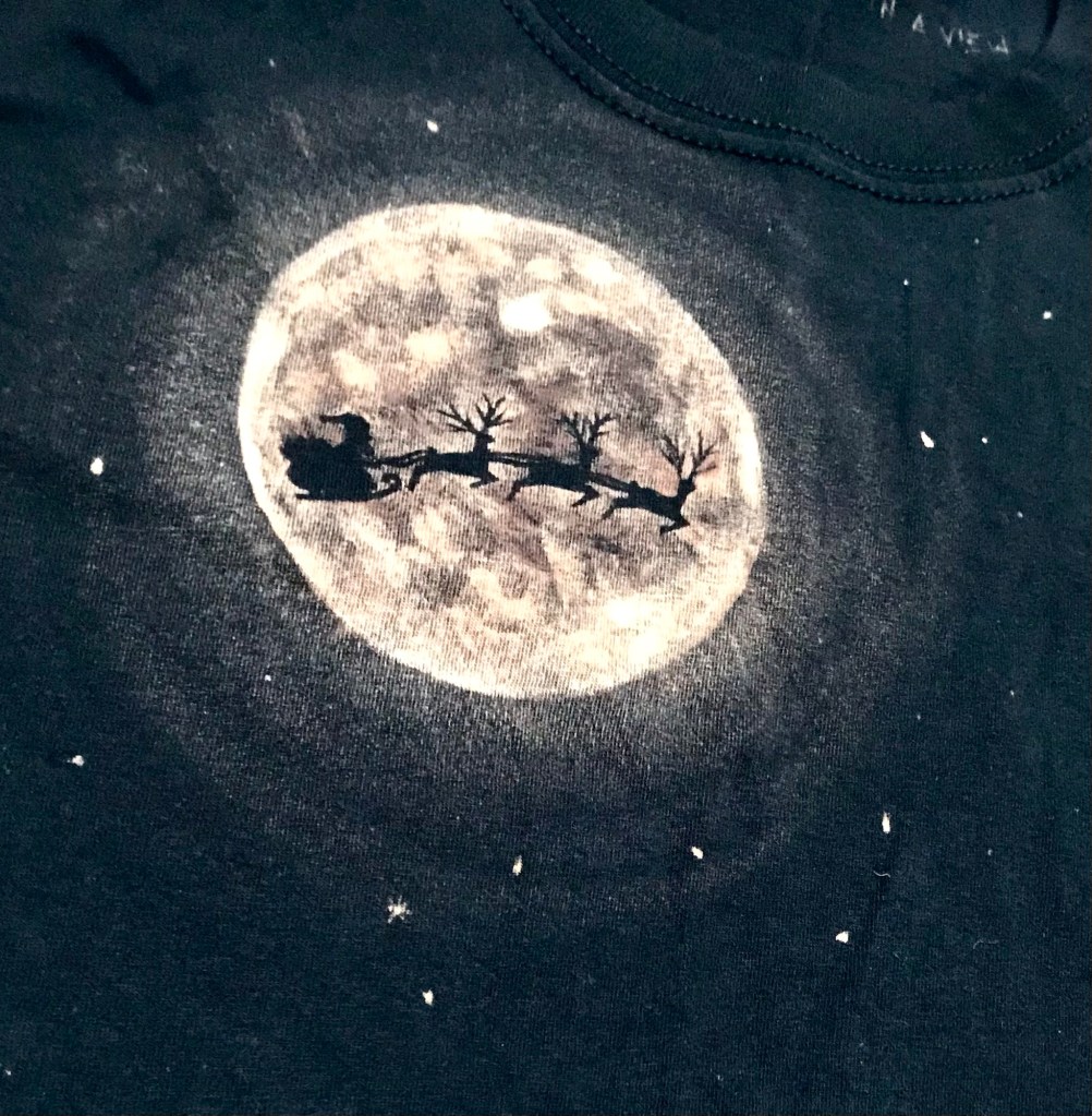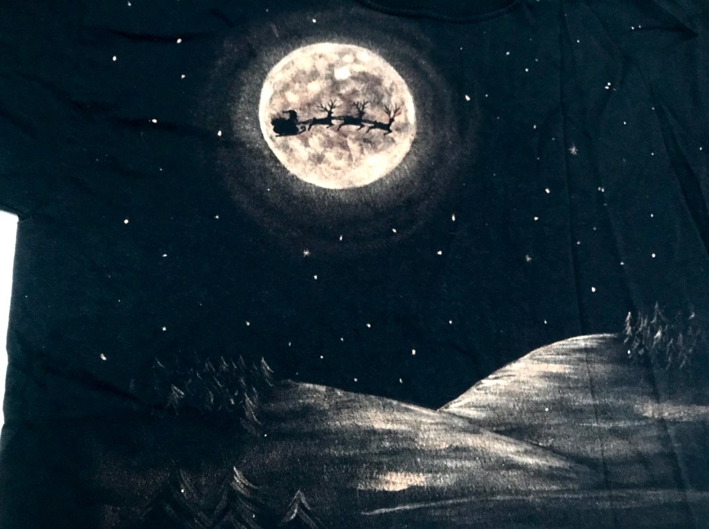 Father Christmas on his sled, probably delivering presents, pulled by reindeer across the full moon. Also available with long sleeves here.
